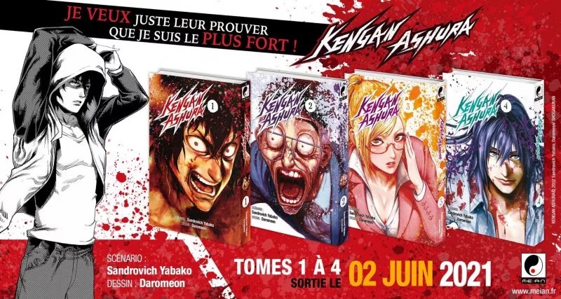 地下闘技場の最年少チャンピオン範馬刃牙と、刃牙の父親であり地上最強の生物と謳われる範馬勇次郎を中心とした様々な格闘家との闘いが織り成す長編格闘ドラマ。最初のシリーズの完全版の24巻分の次に、その続編の完全版の17巻分も終わらせ、現在はアートブックと第三シリーズの12巻まで仏訳進めました。